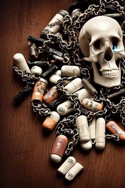 beautifull and very tired womanlooking pile Off pills, drugs, cigarrette boxes and a skull on a w...Show more