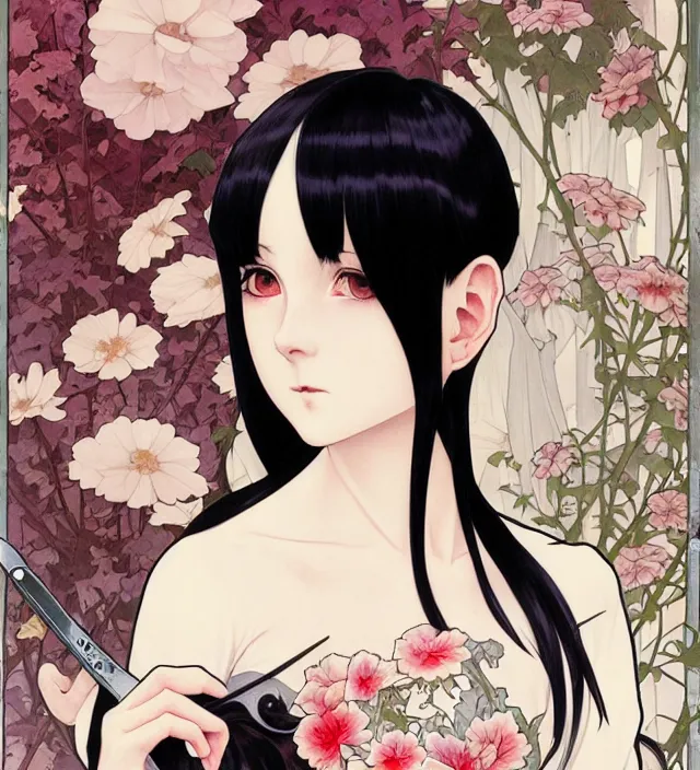 portrait of a morbid 18 year old young woman wearing a cottage-core aesthetic dress with straight...Show more