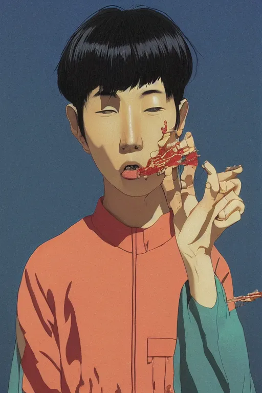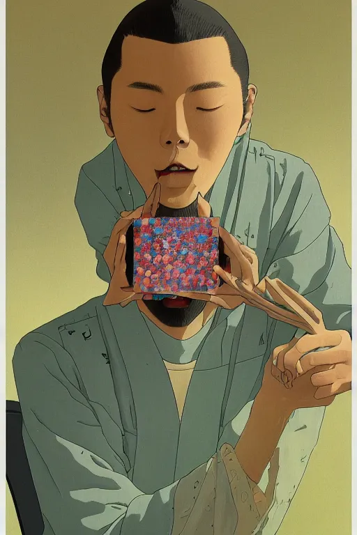 a scifi closeup portrait of a young japanese man licking a blotter paper of LSD acid on his tongu...Show more