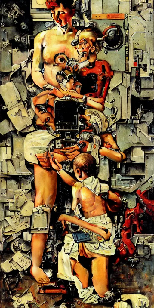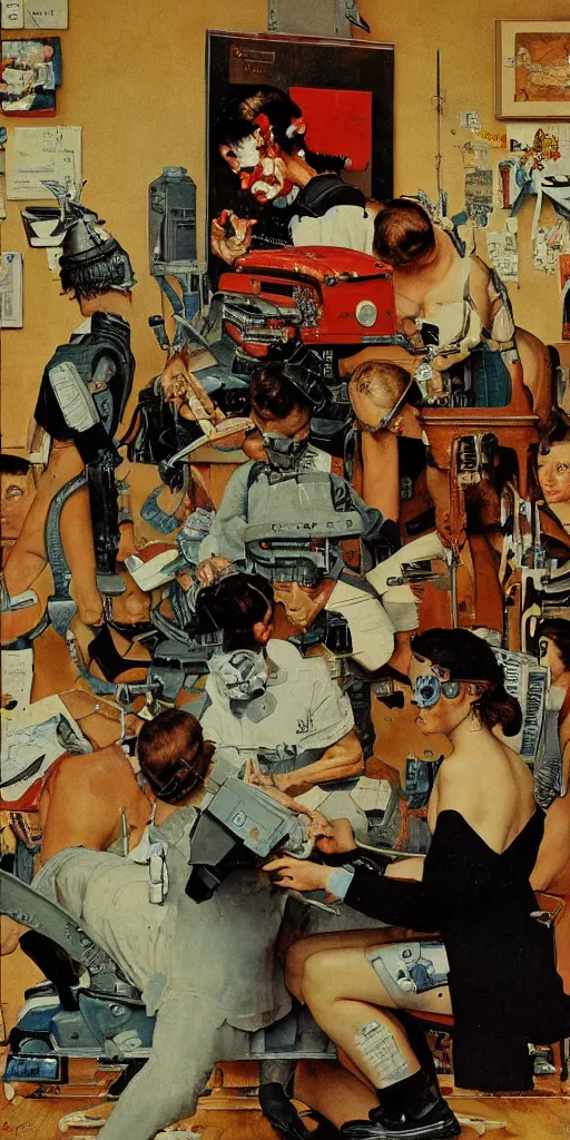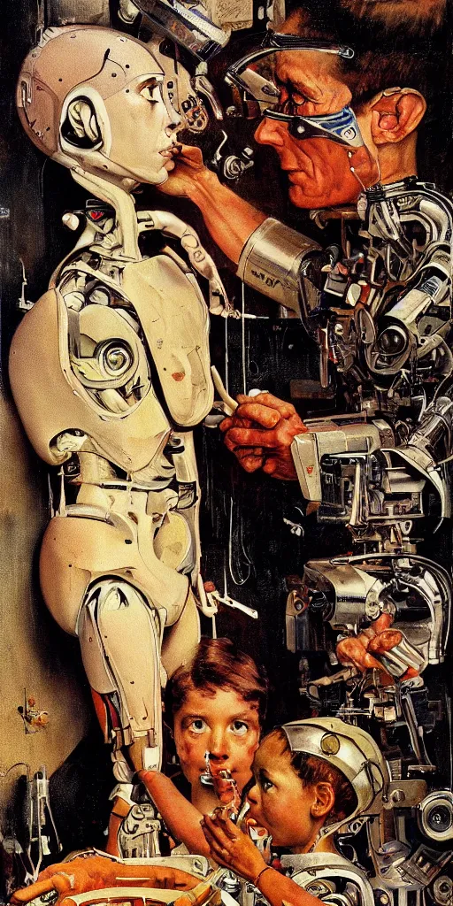 Cyborg AI painting a portrait of it self. Norman Rockwell style. Ultra-high details.