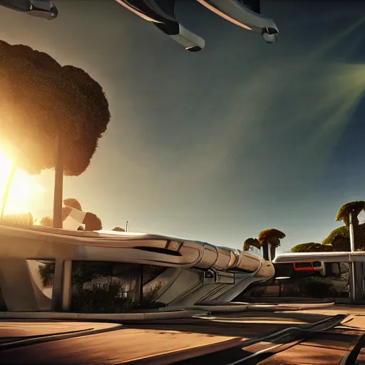 high detailed photorealistic image of a retro Futurism inspired by Jacque Fresco. by Tim Razumovsky. sun rays shine upon it. mist. science. unreal engine. octane render