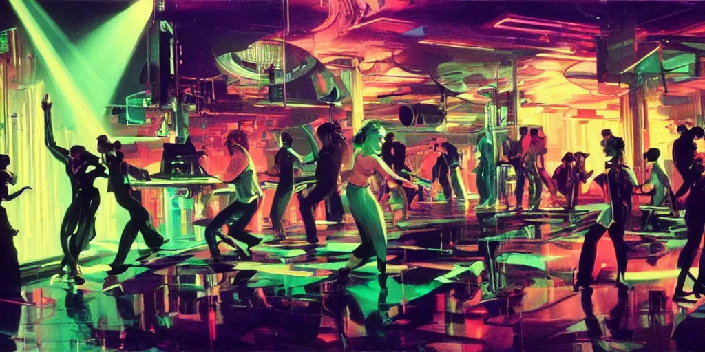 people dancing in a cyberpunk nightclub with a large aquarium. smoky room with lasers and neon lights. Painting by Syd Mead. 70's Sci-Fi. highly detailed digital art, trending on artstation.