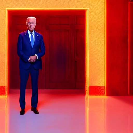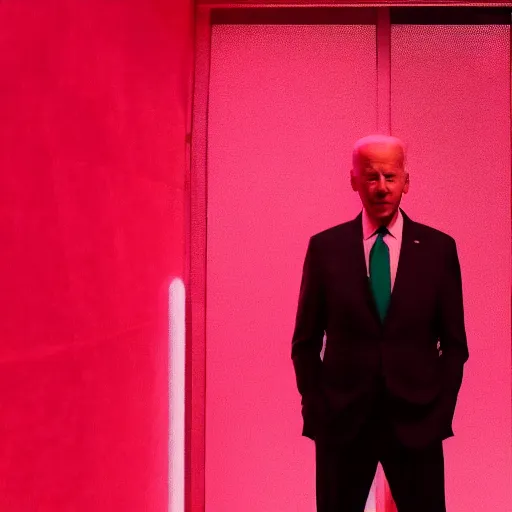 Joe Biden standing in a room engulfed in red light, cinematic, bloom, breathtaking, illustration