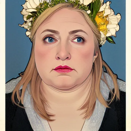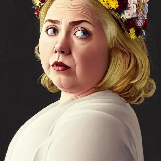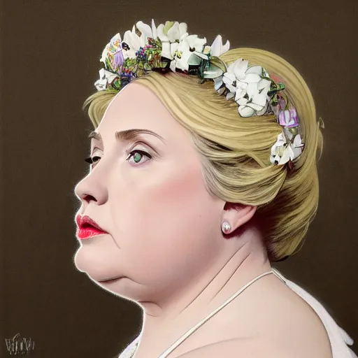 side portrait of morbidly obese Hillary Clinton, blond hair, flower crown, white dress, headshot,...Show more