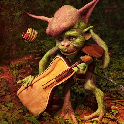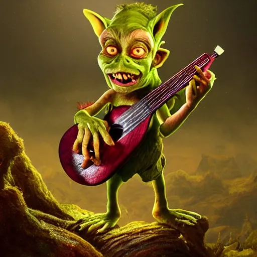 a cute goblin playing a lute, in the style of boris valejo and patrick woodroffe, fantastic, dramatic lighting, forest, hyperrealistic, detailed, octane render
