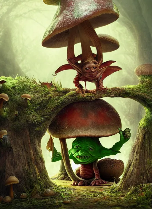 a cute goblin sitting on a mushroom playing a lute, in the style of boris valejo and patrick woodroffe, fantastic, dramatic lighting, forest, hyperrealistic, detailed, octane render