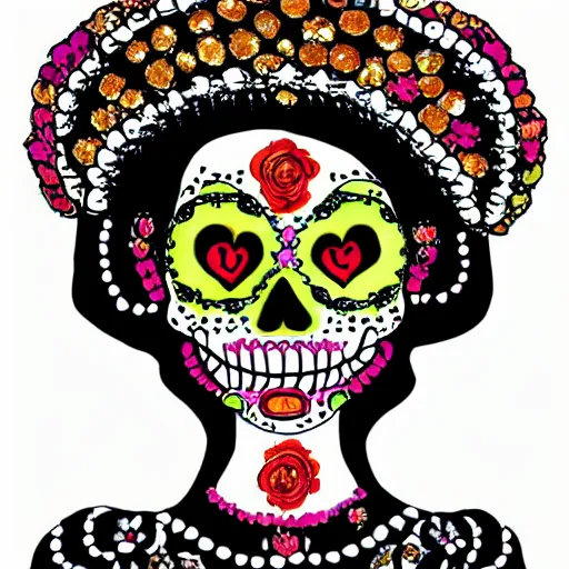 Prompt: illustration of a sugar skull day of the dead girl, art by michael sowa