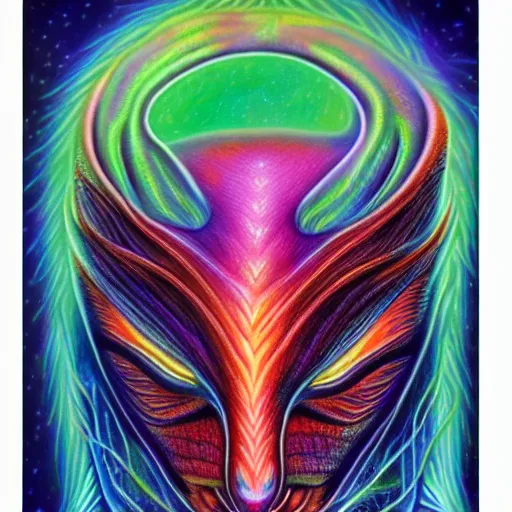 cosmic alien lightning fox , Alex grey, realistic 4k deep color