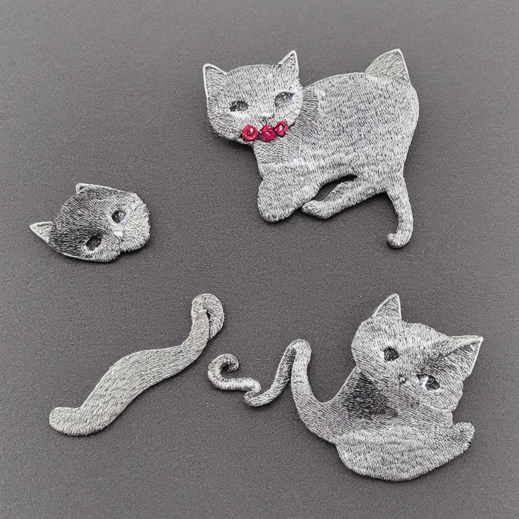 Silver embroidered cat brooch, realistic, clean,