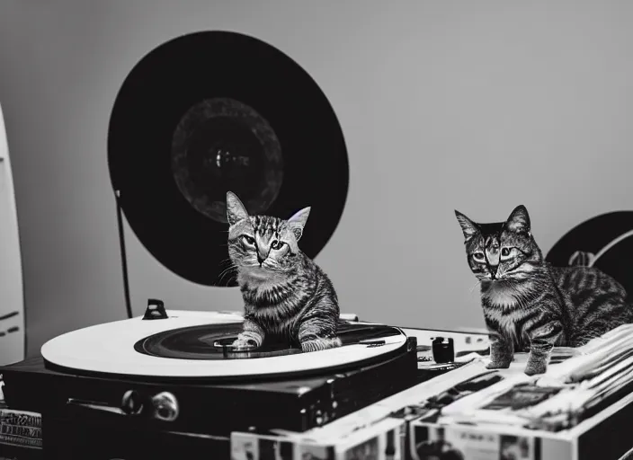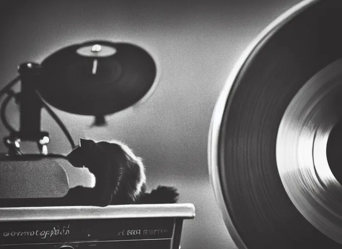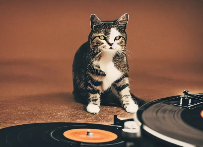 photography of a Cat sitting on a record player. in a room full of vinyls and posters out of the 70's, photorealistic, raining award winning photo, 100mm, sharp, high res