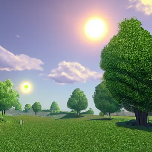 green hill with fake clouds and fake sun, cloned houses, day, 8k, realistic, high details, volumetric light