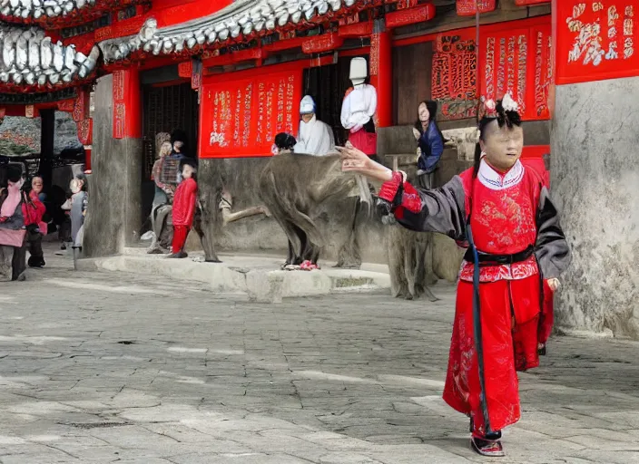 Prompt: VFX movie of a Tibetan monk dancing with fire in a Chinese courtyard by Emmanuel Lubezki