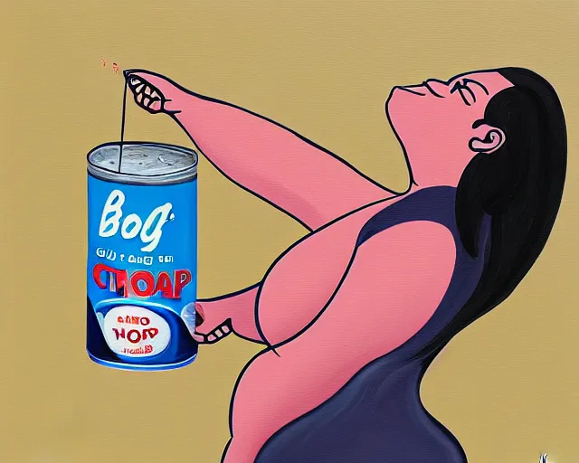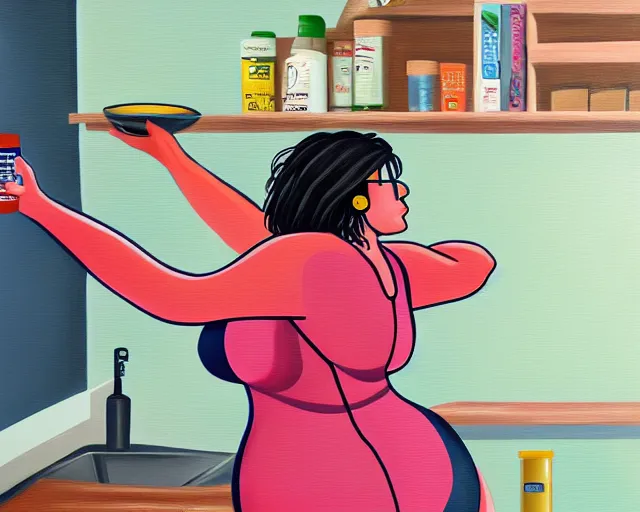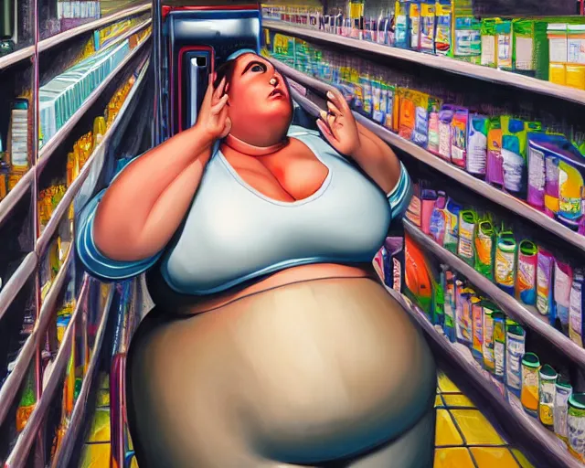 BBW Cyborg Woman struggling to reach for a can of soup on the top shelf, art station painting