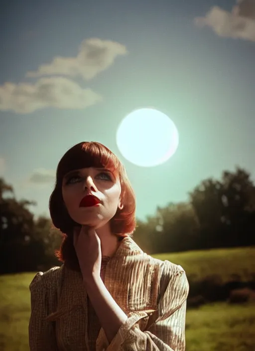beautiful Felicita Jones wearing a vintage Raypunk outfit, accurate anatomy, abstract sun in back...Show more