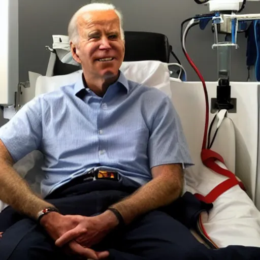 Joe Biden sitting in a hospital bed with tubes and wires attached to him