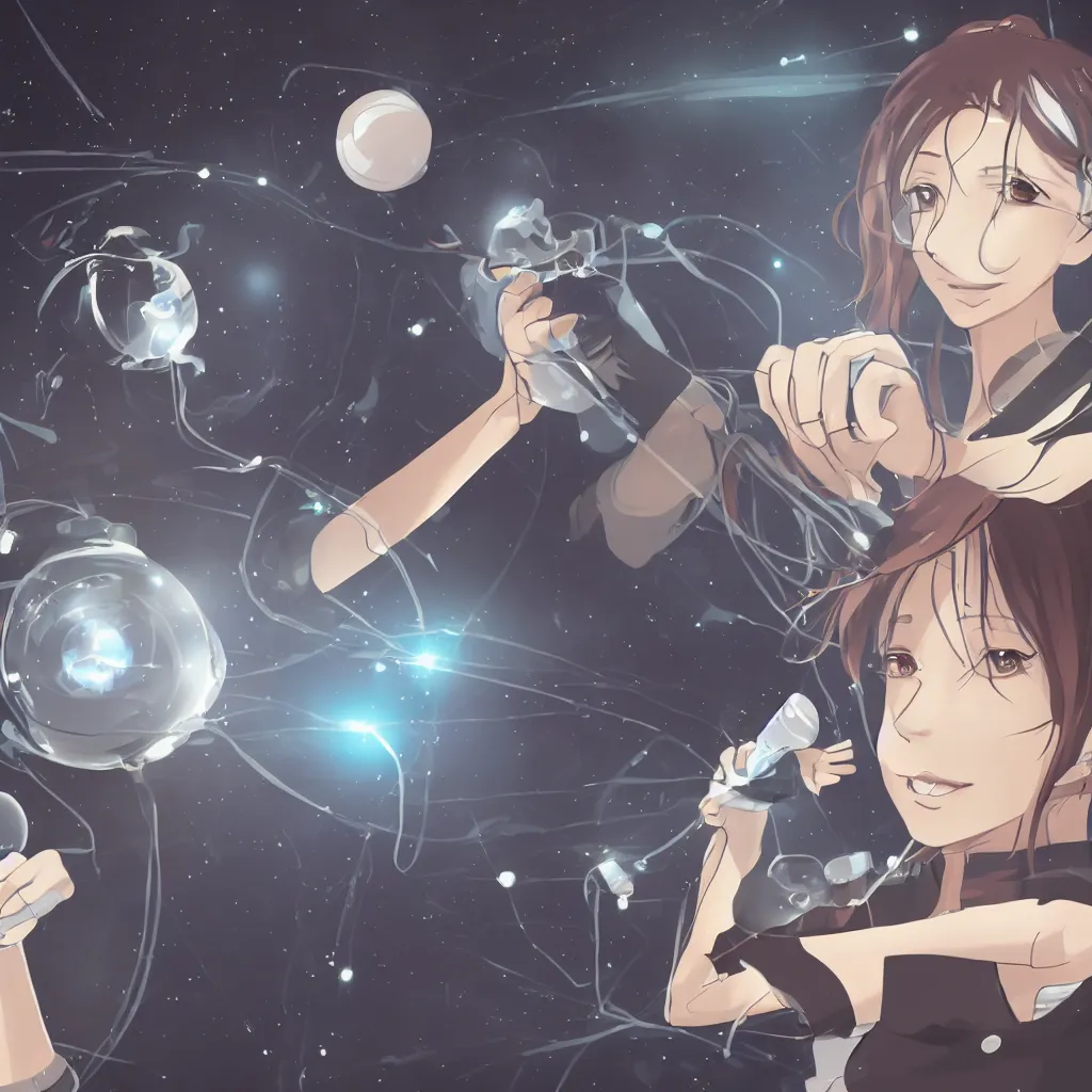 an anime art of a female scientist in a laboratory holding a black hole, concept art, stylised, elegant, illustration, 4k wallpaper, high detailed