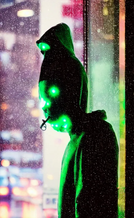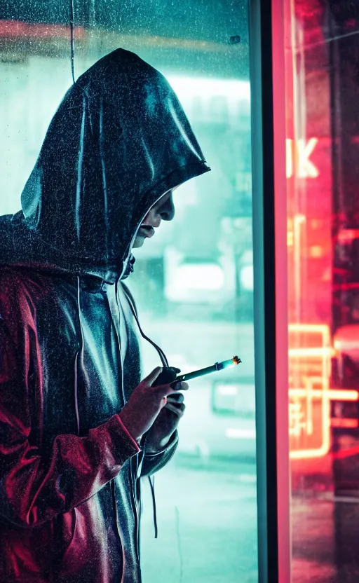 a hooded cyborg smoking a cigarette outside of a windowed storefront, neon lights reflecting, pouring rain, high contrast, faded colors, depth of field, detailed 8k sci-fi portrait