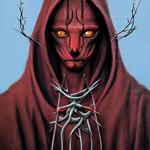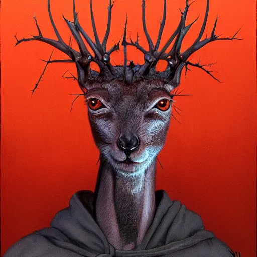 portrait of a dik dik with red glowing eyes in hood and crown of thorns, dark fantasy, Warhammer, artstation painted by Zdislav Beksinski and Wayne Barlowe