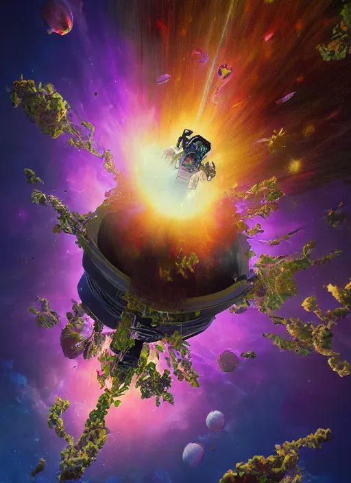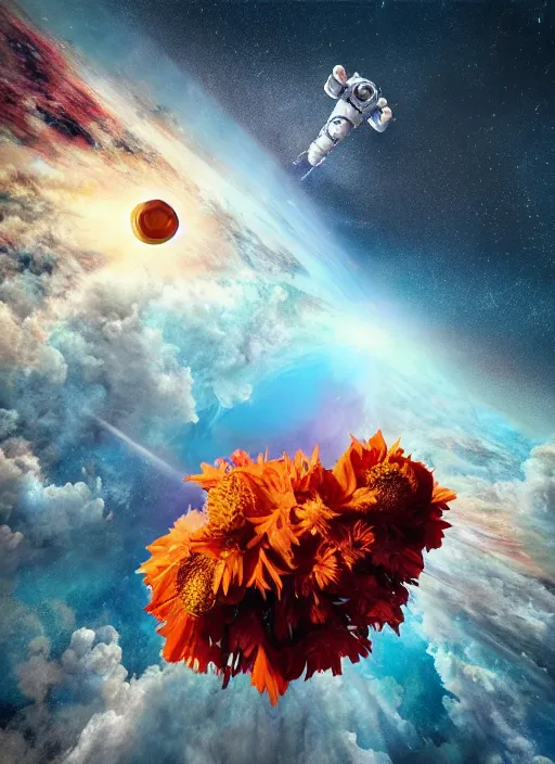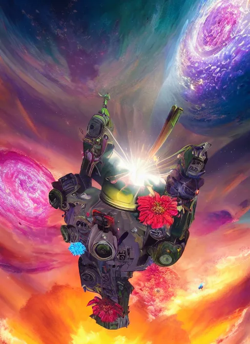 An epic fantastic realism comic book style painting of the most beautiful flowers launched into s...Show more