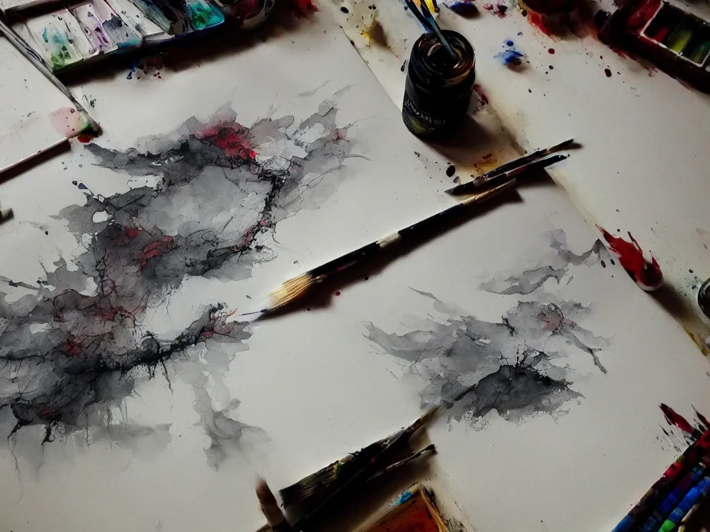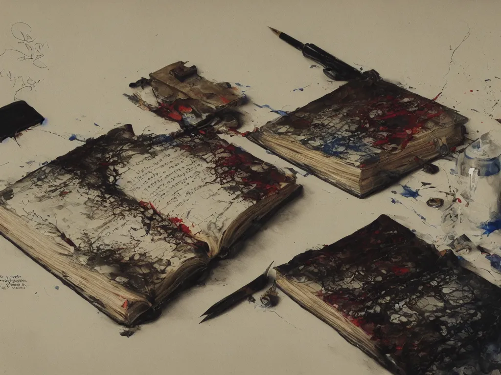 detailed painting of a book bleeding ink onto a desk, by John Howe and Krenz Cushart