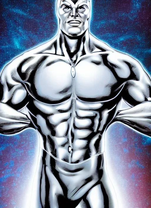 A full portrait photo of silver surfer marvel, f/22, 35mm, 2700K, lighting, perfect faces, award winning photography.
