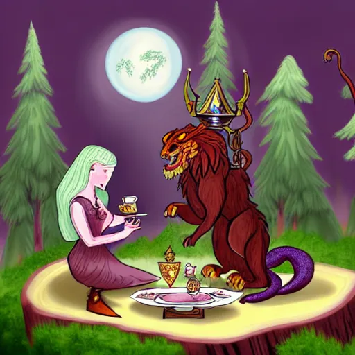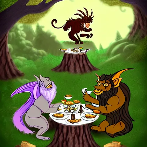 fantasy illustration of a manticore at a tea party with a gnome wizard and and ogre knight of the realm. Setting is a forest. Table is a tree stump with a kettle on top