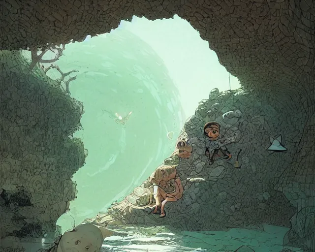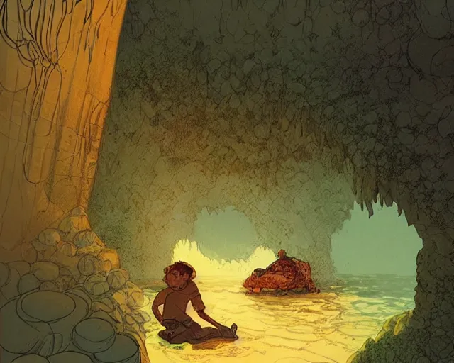 a boy sneaking behind a giant sleeping cyclops, in a cave by the water, digital art, illustrated by james gurney and victo ngai