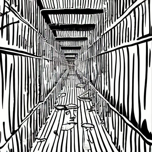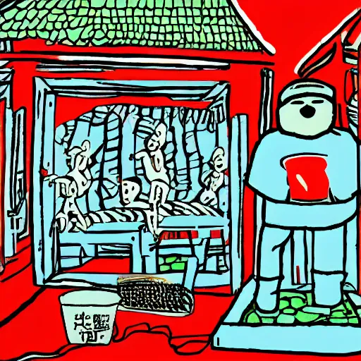 a chinese prison, in the style of daniel johnston and outsider art, 8 k, line brush, minimal, brightly coloured, flat, stark, overlaid with chinese adverts