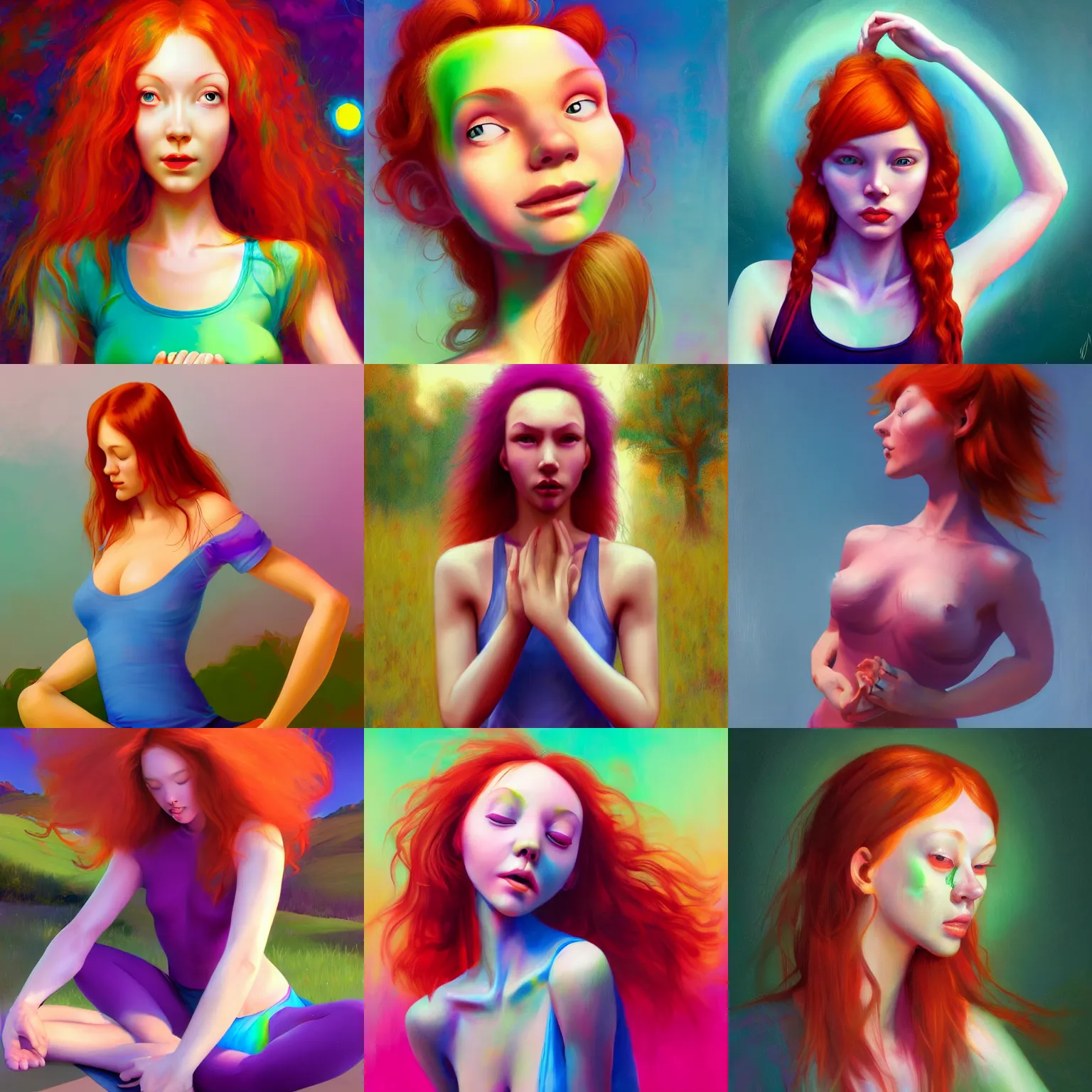 a fiesty redhead hippie girl with hairy armpits, yoga master, mark ryden, yanjun cheng, synthwave colors, artstation hd