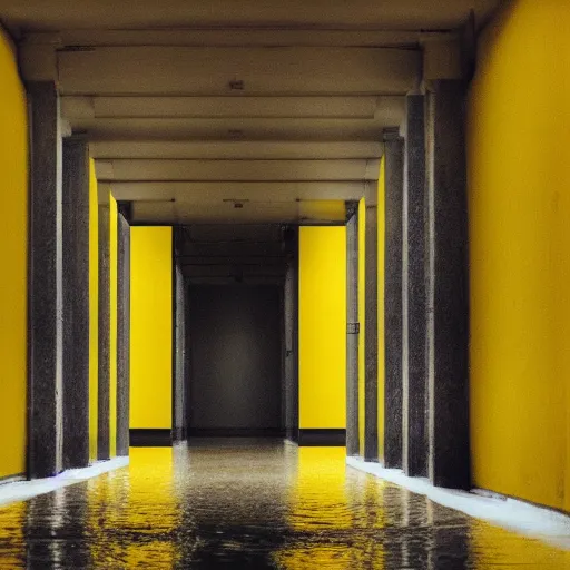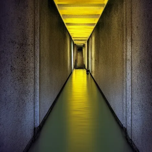 an yellow endless hallway with dark shallow water at the bottem of it, liminal, highly detailed,