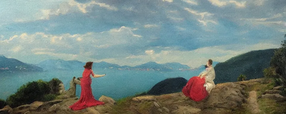 landscape painting of a woman! looking over lake como! cloudy morning!!! by edward williams