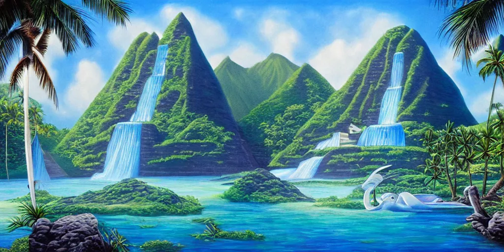 polynesian peace goddess, crystal clear lemuria sunken architectural marvels, crisp realistic fantasy art painting