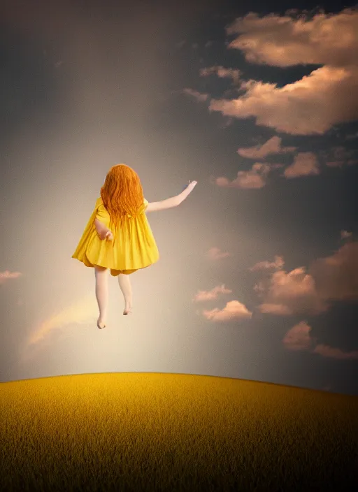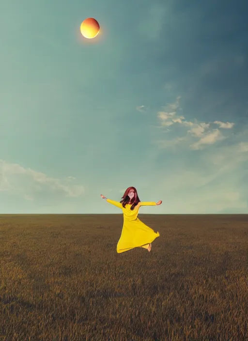 a yellow landscape with houses, big red orb in the sky, behind the landscape, a girl levitating above the landscape by miraruido, volumetric lighting, 8 k