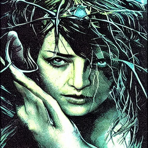 a still from “ lord of the rings ” of a head and shoulders portrait of a female elf wizard, comic book cover photo by dave mckean