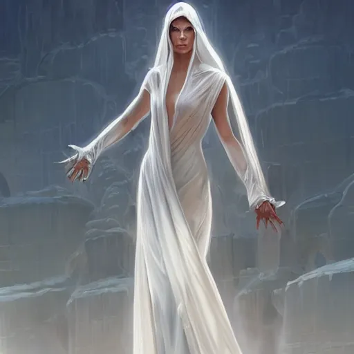 a female angel of mercy wearing see through white long dress by michael komarck, olive skinned, s...Show more