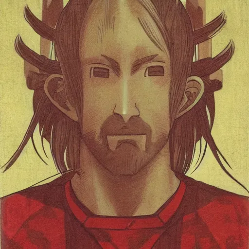 anime a portrait of man with hand growing from his head, holding a red crystal