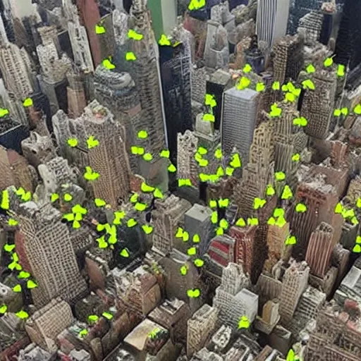 colossal pickles flying over new york city, there are guns on the outside of the pickles that are firing projectiles down upon the city