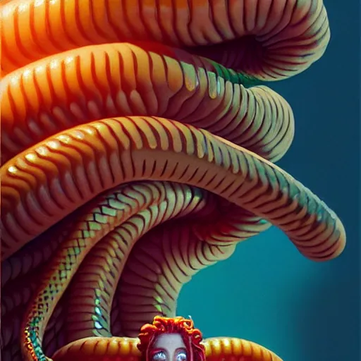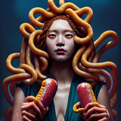 medusa with hotdogs instead of snakes. intricate abstract. intricate artwork. by tooth wu, wlop,...Show more