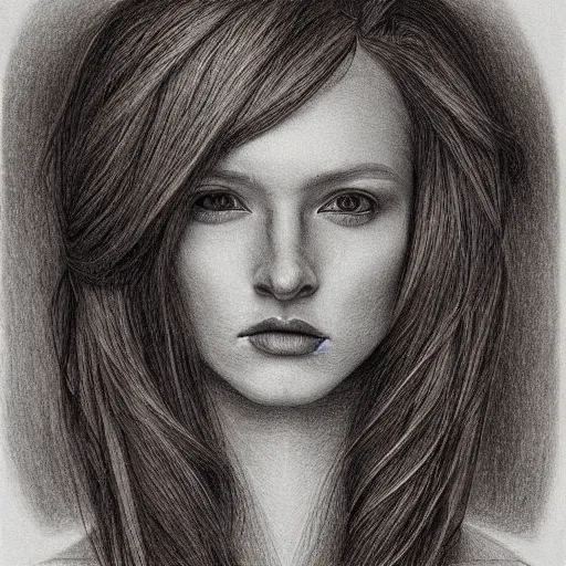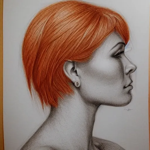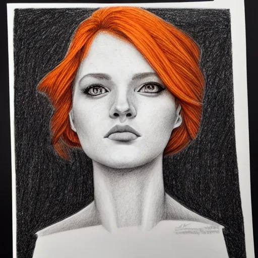 a symmetrical portrait of a beautiful orange - haired woman, face and shoulders, pencil drawing, intricate, aesthetic!!!!!, god rays, dramatic, ultra detailed
