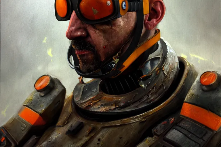 photorealistic oil painting of gordon freeman in a damaged, scratched and worn down hev suit, nig...Show more