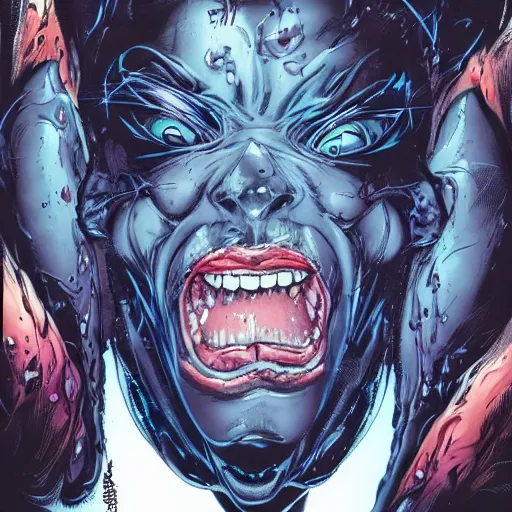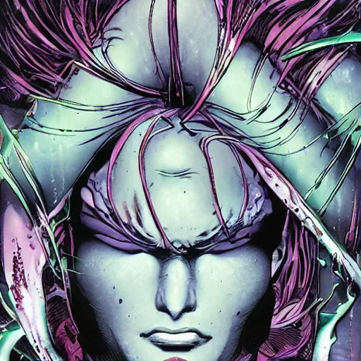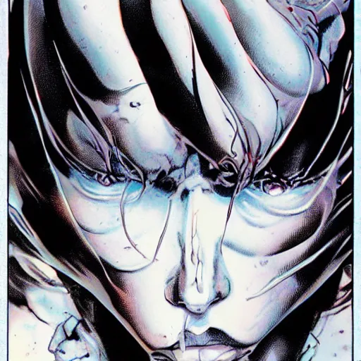 closeup of face melting in agony, inside dark oil, frontal picture, by masamune shirow, josan gonzales