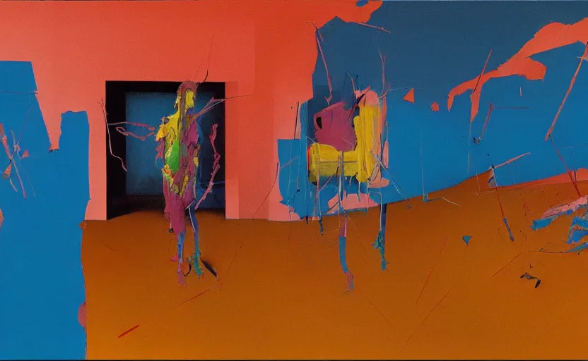 Prompt: an empty room in the style of constructivism, exhibition of paintings, trash bag on head, blurred, slit - scan, grotesque, doomed, neural acrylic paint, high resolution, gouache on canvas, ultra detailed, vibrant colors, grotesque, wrapped thermal background, art by francis bacon, beksinski painting