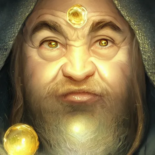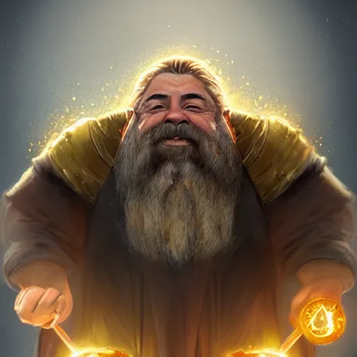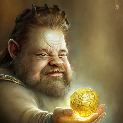 symmetrical portrait of a happy dwarf showing off the humongous sparkling gold nugget, realistic,...Show more