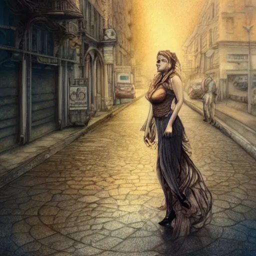 hyper realistic full body pencil drawing of a woman steampunk standing on a road, water color, detailed, rim light, diffused, intricate, by anna dittmann,