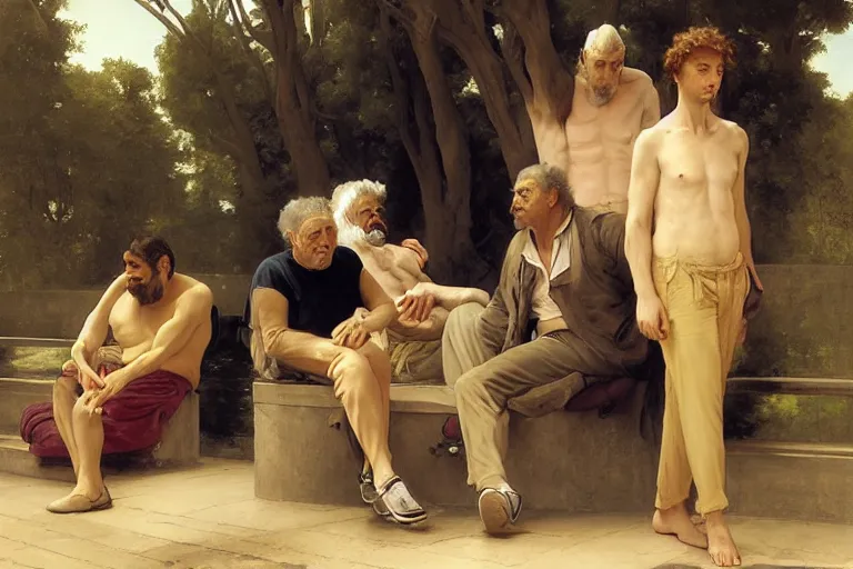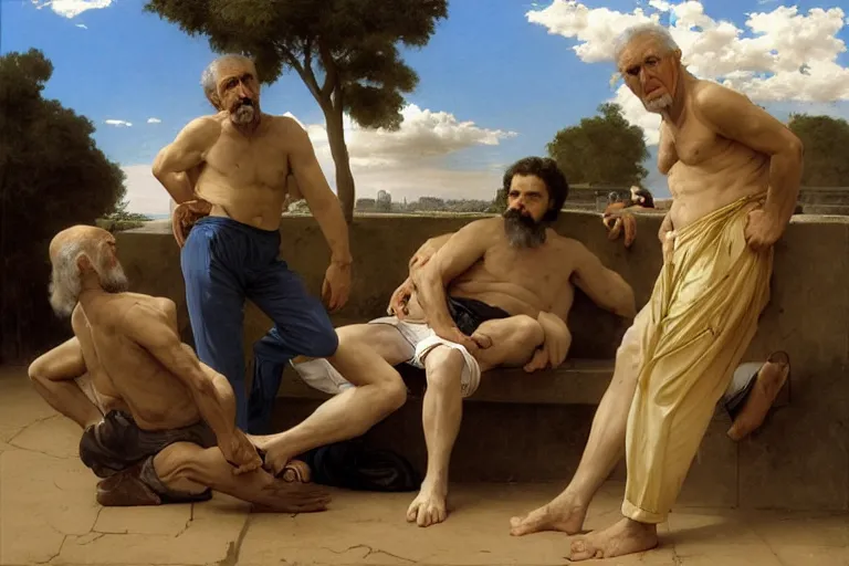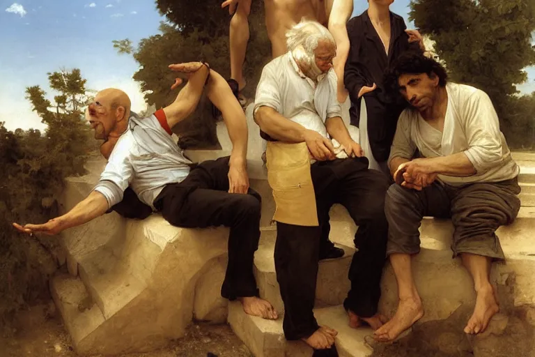 tired old man with scanty clothing is supported by tired young black and arab commuters wearing t...Show more