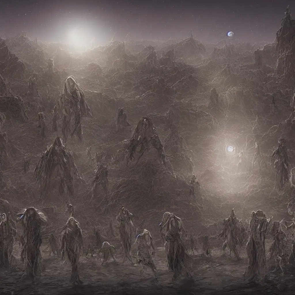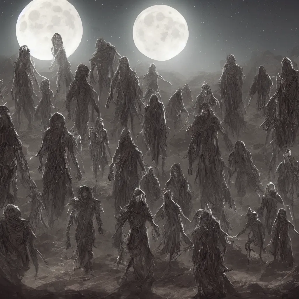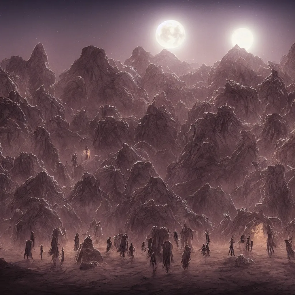 illustration of a small group of cloaked figures roaming the desert at night, surrounded by a labyrinth of organic crystal structures, weakly illuminated by the moon above, concept art, artstation