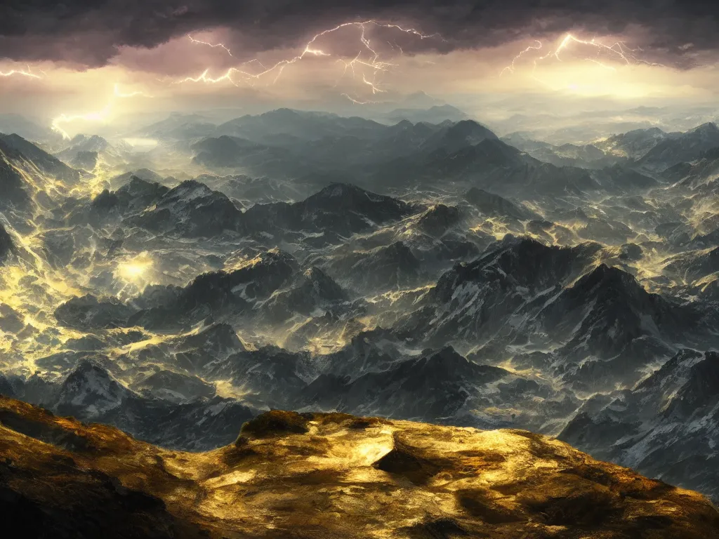 realistic view from a mountaintop, high mountains, alps, pyranees, digital painting, 4 k, wallpaper, realistic lightning