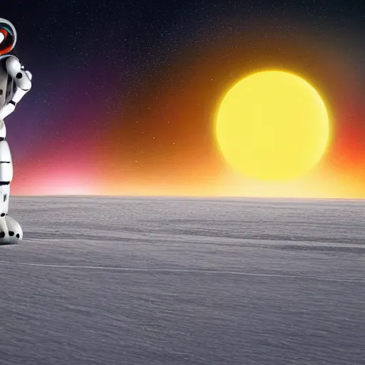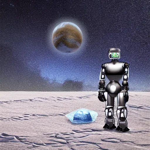 humanoid robot in an ice desert at night with a planet with rings in the background, extremely detailed, hopeful, digital art