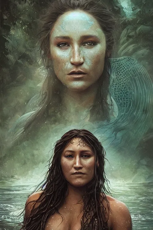 a beautiful portrait of q'orianka kilcher as a mermaid in a river of the amazon, hyper realistic face, beautiful eyes, fantasy art, in the style of greg rutkowski, intricate, hyper detailed, smooth