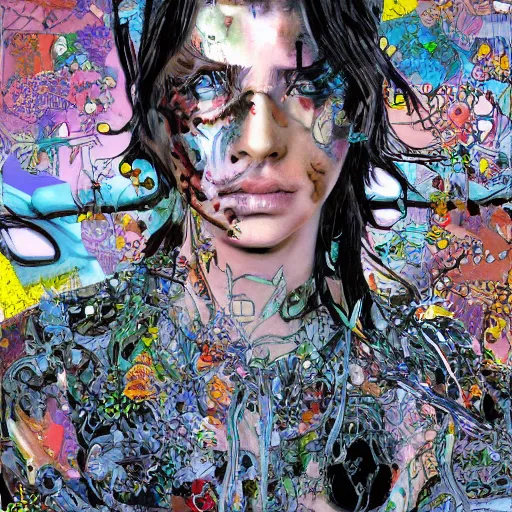 hyperrealism, cyberpunk girl, by yoshitaka amano, style wrapped in flowers and wired in the style of yayoi kusama, by barry lyndon ultra detailed high resolution, 8 0 s sci - fi - h 7 6 8